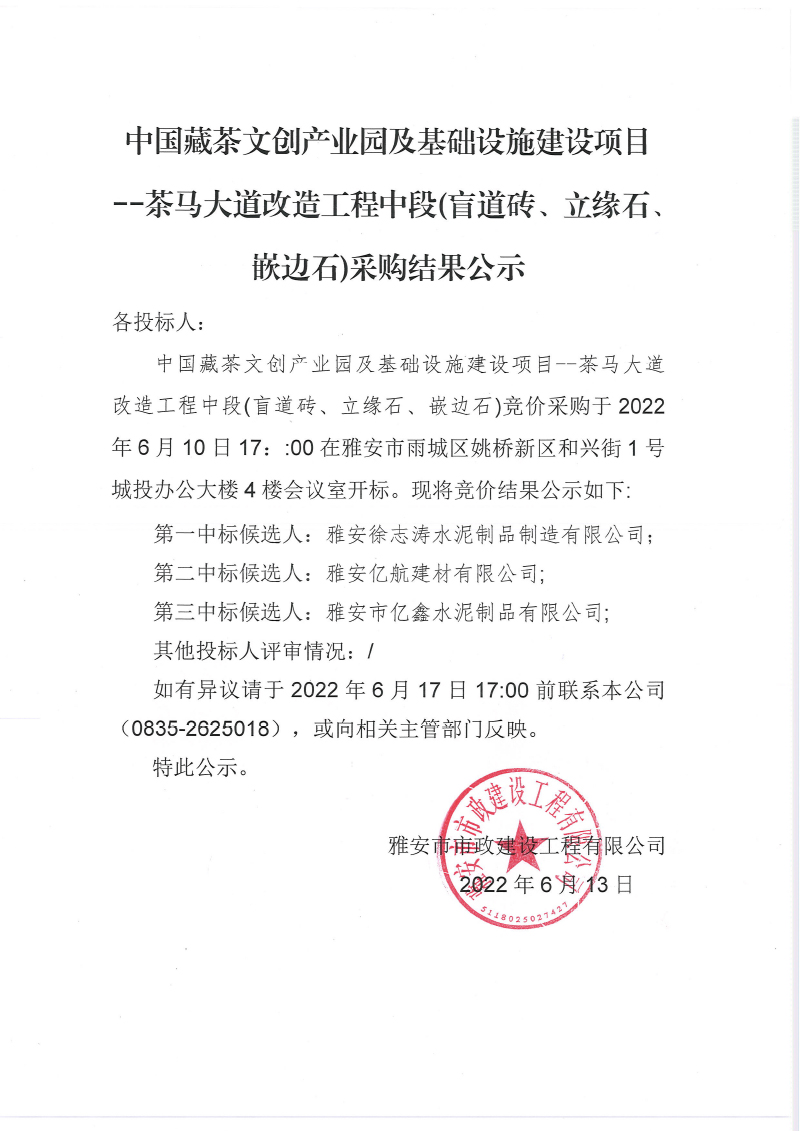 中國藏茶文創(chuàng)產(chǎn)業(yè)園及基礎(chǔ)設(shè)施建設(shè)項(xiàng) 茶馬大道改造工程中段盲道磚、混凝土嵌邊石采購結(jié)果公示