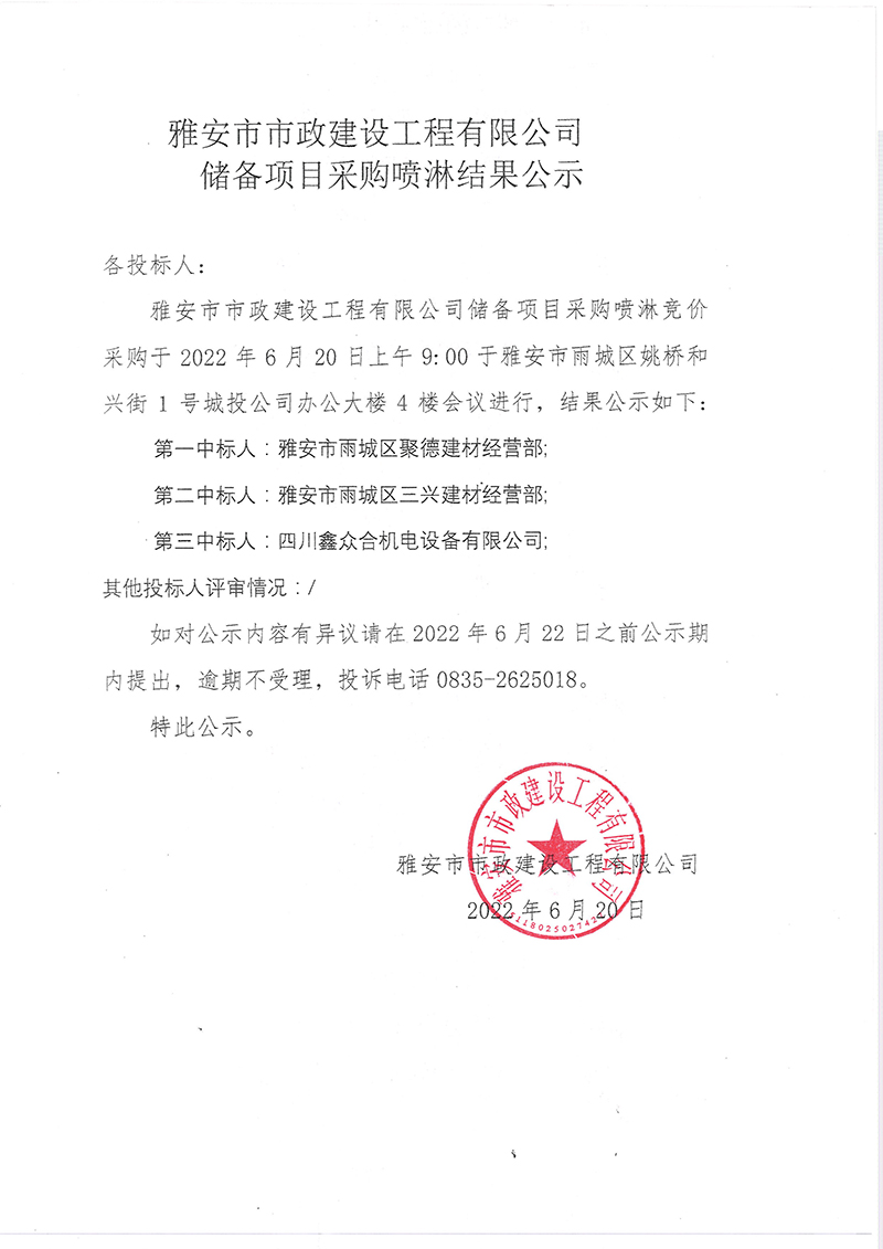 雅安市市政建設工程有限公司儲備項目噴淋系統(tǒng)結果公示