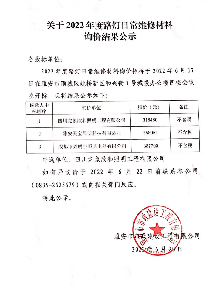 2022年路燈日常維修材料詢價結果公示