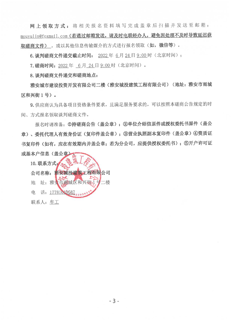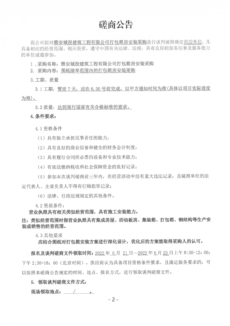 雅安城投建筑工程有限公司打包箱房安裝采購(gòu)談判磋商公告
