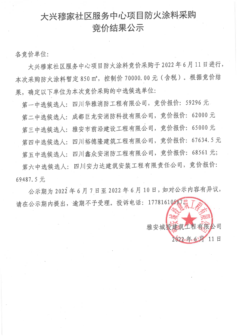 大興穆家社區(qū)服務(wù)中心項(xiàng)目防火涂料采購(gòu)競(jìng)價(jià)結(jié)果公示