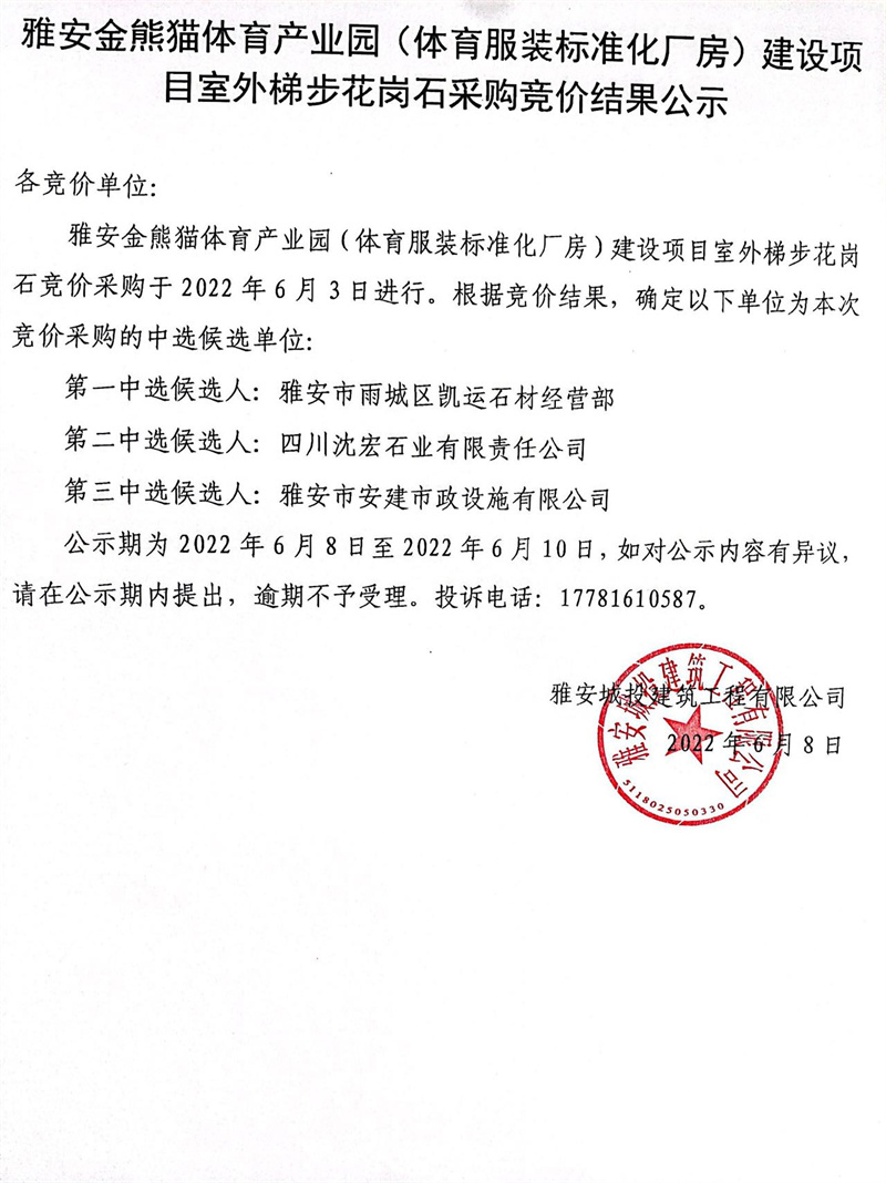 雅安市金熊貓?bào)w育產(chǎn)業(yè)園標(biāo)準(zhǔn)化廠房項(xiàng)目室外梯步花崗石采購(gòu)競(jìng)價(jià)結(jié)果公示