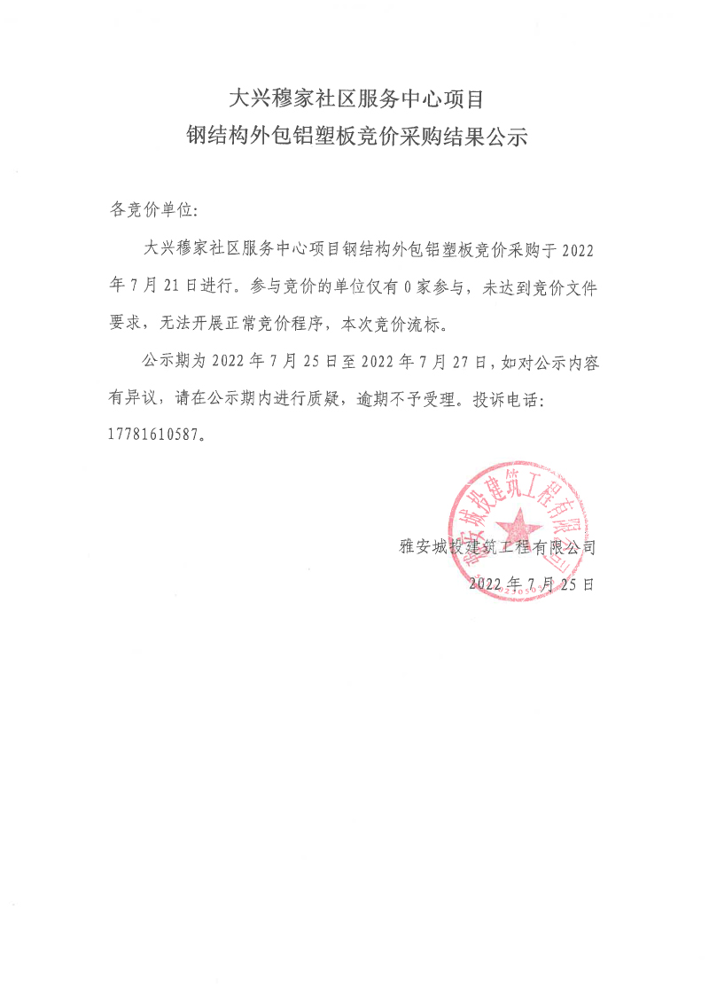 大興穆家社區(qū)服務(wù)中心項(xiàng)目鋼結(jié)構(gòu)外包鋁塑板競價(jià)采購結(jié)果公示