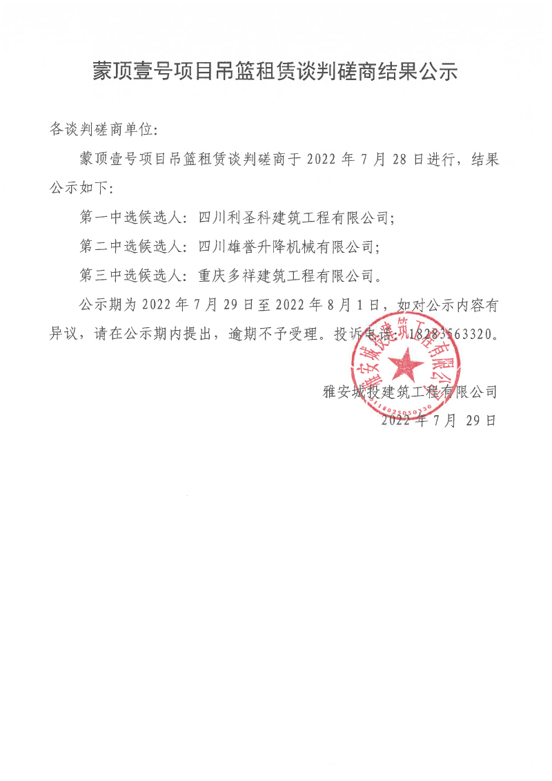 蒙頂壹號項目吊籃租賃談判磋商結果公示