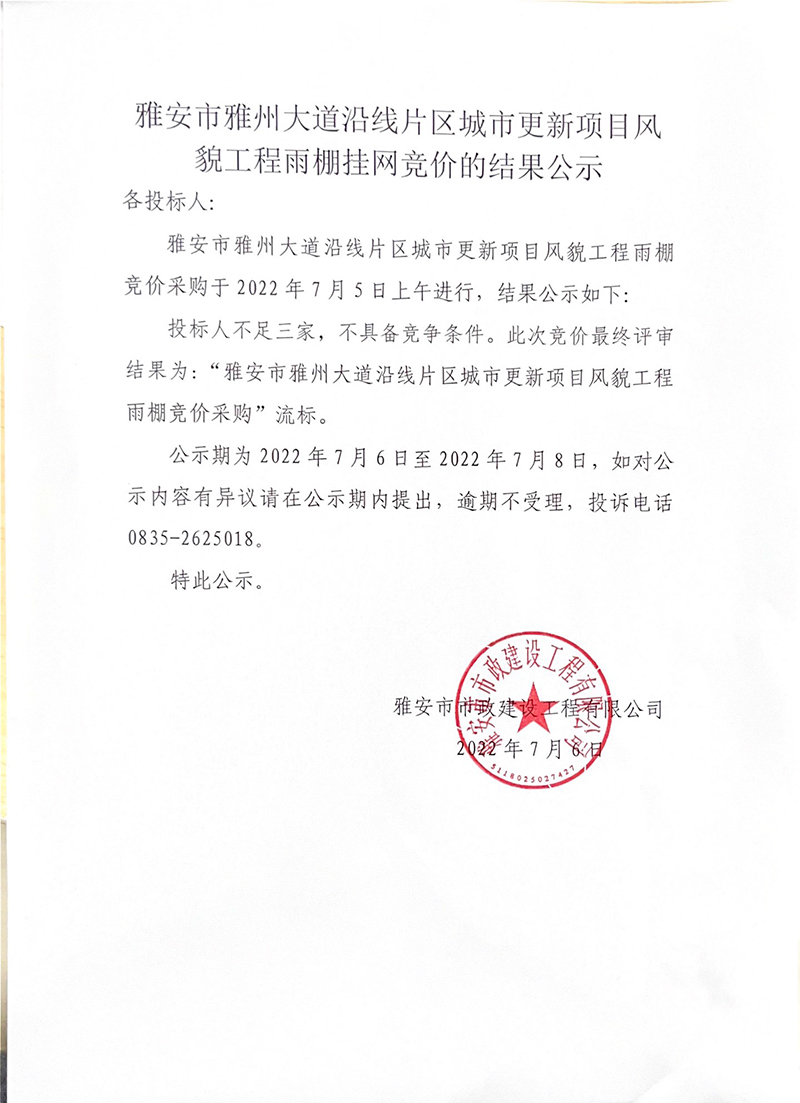 雅安市雅州大道沿線片區(qū)城市更新項目風貌工程雨棚競價結果公示