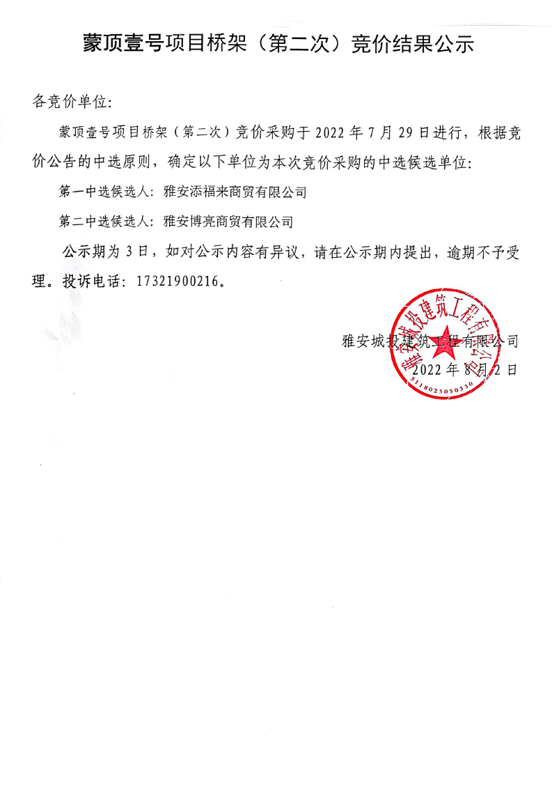 蒙頂壹號(hào)項(xiàng)目橋架(第二次)競(jìng)價(jià)結(jié)果公示