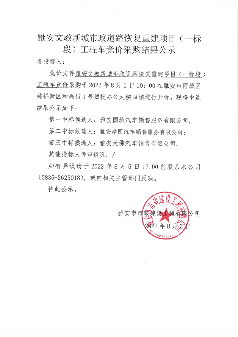 雅安文教新城市政道路恢復(fù)重建項(xiàng)目(一標(biāo)段)工程車競價(jià)采購結(jié)果公示
