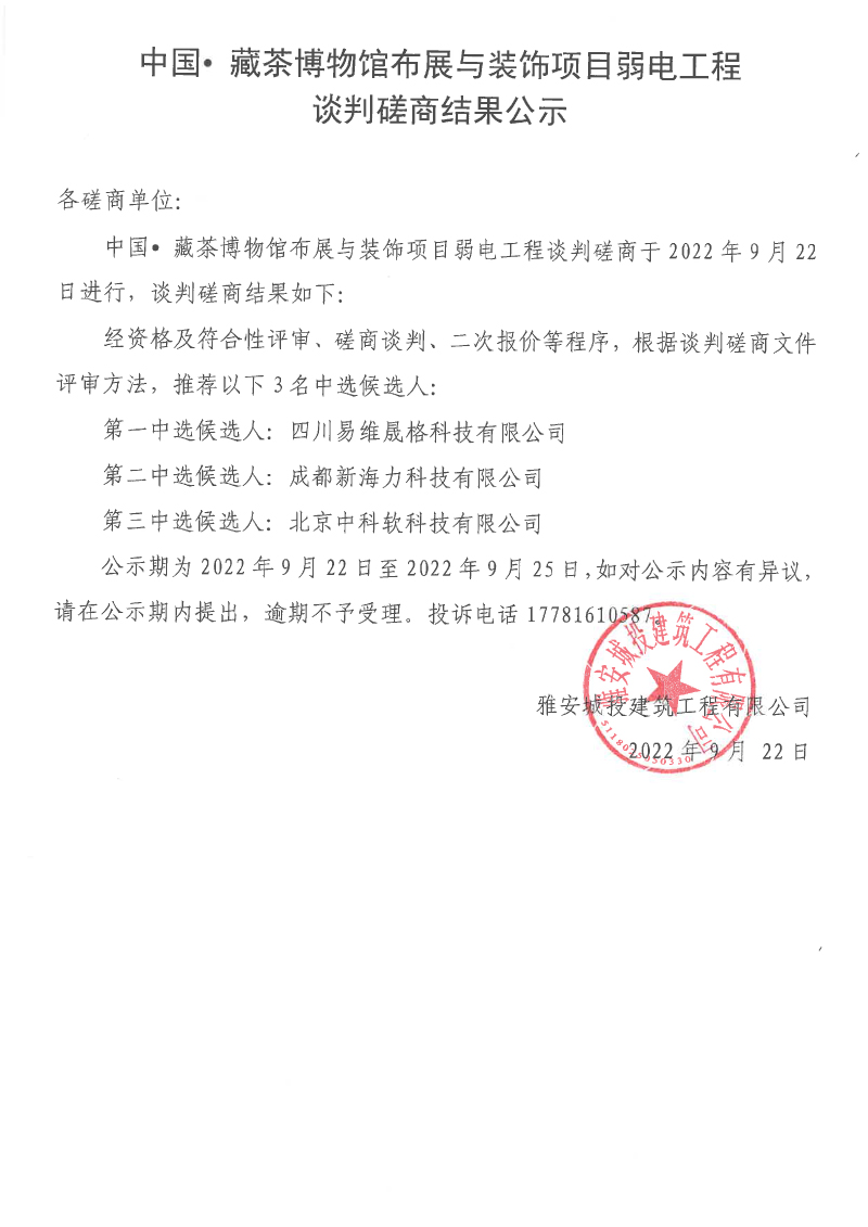 中國• 藏茶博物館布展與裝飾項目弱電工程談判磋商結(jié)果公示