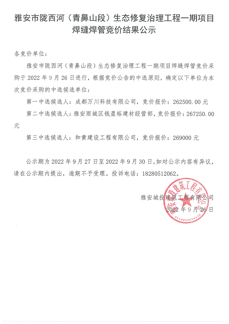 雅安市隴西河(青鼻山段)生態(tài)修復(fù)治理工程一期項(xiàng)目焊縫焊管采購競價(jià)結(jié)果公示