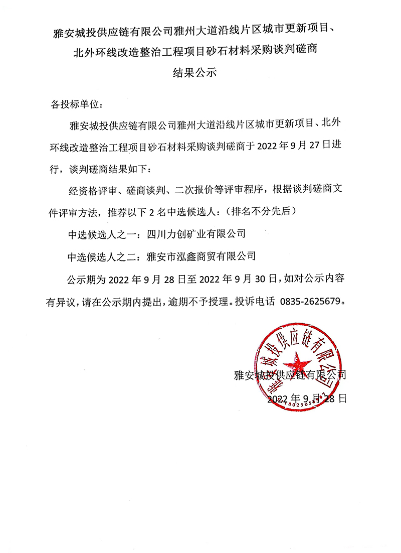 雅安城投供應鏈有限公司雅州大道沿線片區(qū)城市更新項目砂石材料采購談判磋商結(jié)果公示