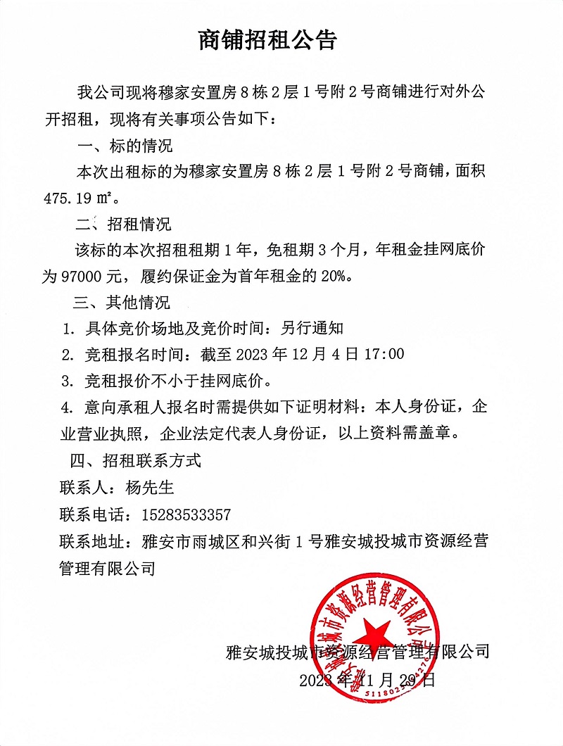 穆家安置房8棟2層1號附2號商鋪招租公告