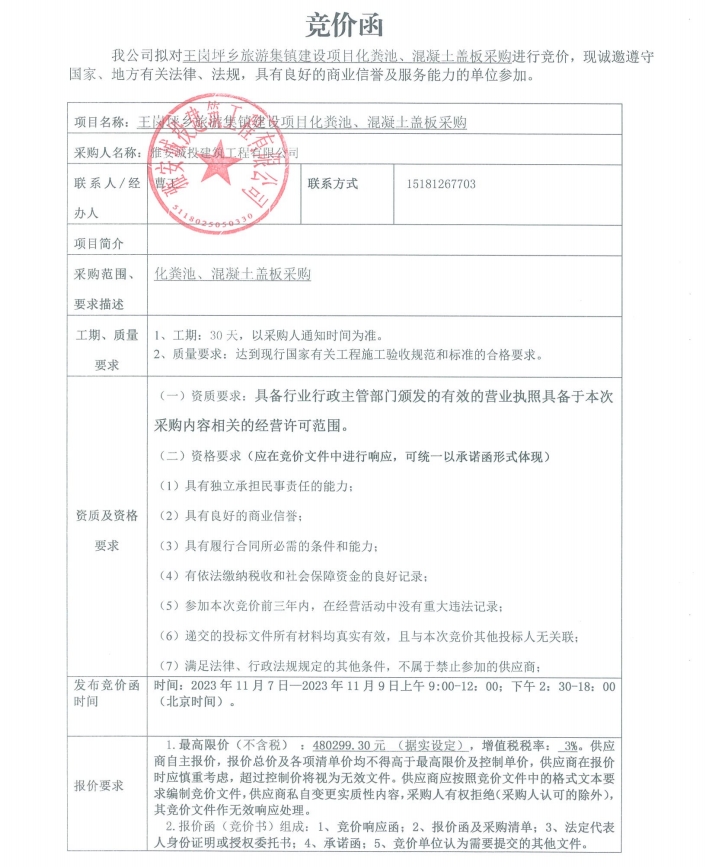 王崗坪鄉(xiāng)旅游集鎮(zhèn)建設(shè)項(xiàng)目化糞池、混凝土蓋板采購(gòu)競(jìng)價(jià)公告