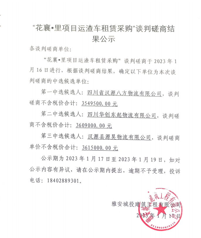 花襄·里項目運渣車租賃采購談判磋商結(jié)果公示