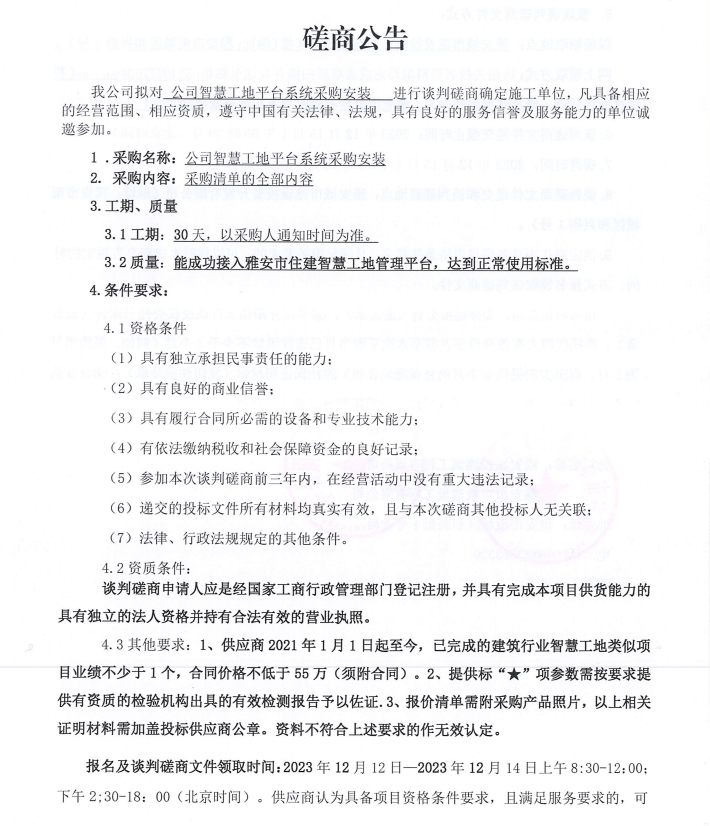 公司智慧工地平臺(tái)系統(tǒng)采購安裝談判磋商公告