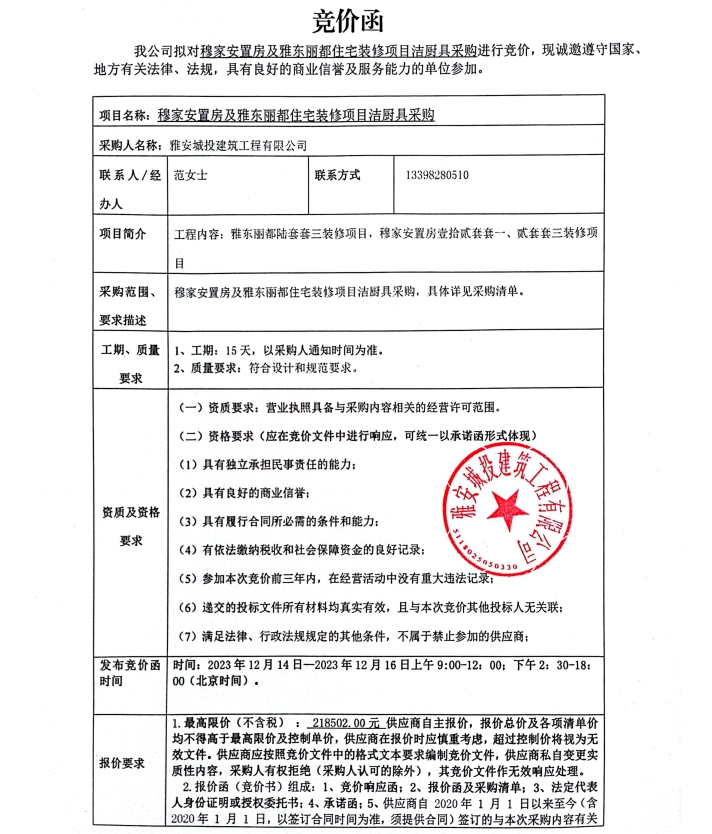 穆家安置房及雅東麗都住宅裝修項(xiàng)目潔廚具采購(gòu)競(jìng)價(jià)公告