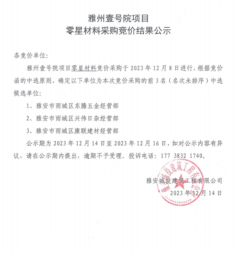 雅州壹號院項(xiàng)目零星材料采購競價(jià)結(jié)果公示