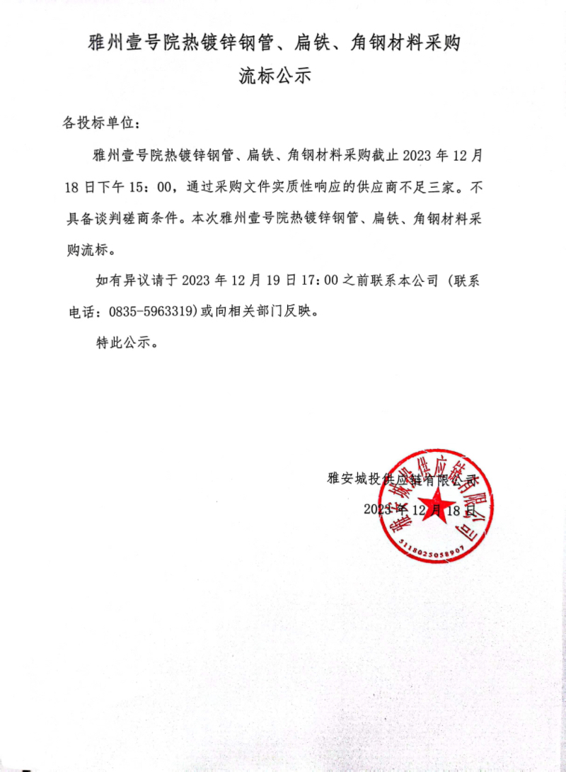 雅州壹號院熱鍍鋅鋼管、扁鐵、角鋼材料采購流標(biāo)公示