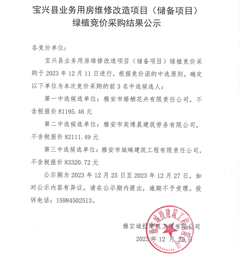 寶興縣業(yè)務(wù)用房維修改造項目(儲備項目)綠植競價采購結(jié)果公示