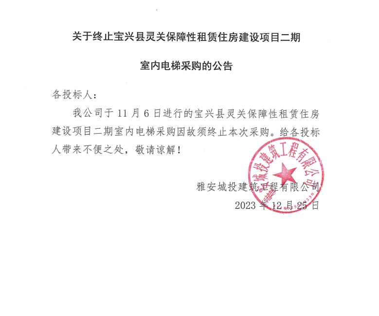 關(guān)于終止寶興縣靈關(guān)保障性租賃住房建設(shè)項目二期室內(nèi)電梯采購的公告