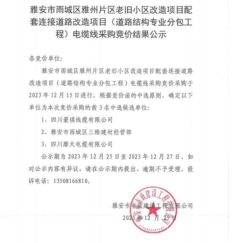 雅安市雨城區(qū)雅州片區(qū)老舊小區(qū)改造項目配套連接道路改造項目(道路結(jié)構(gòu)專業(yè)分包工程)電纜線采購競價結(jié)果公示