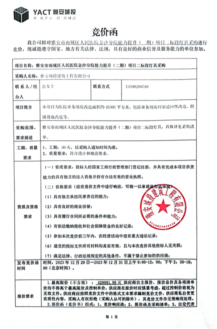 雅安市雨城區(qū)人民醫(yī)院分院能力提升(二期)項目二標(biāo)段燈具采購競價公告