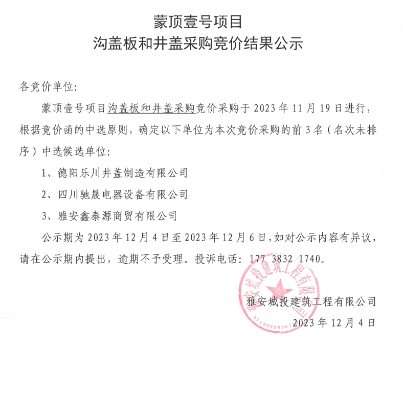 蒙頂壹號(hào)項(xiàng)目溝蓋板和井蓋采購競(jìng)價(jià)結(jié)果公示