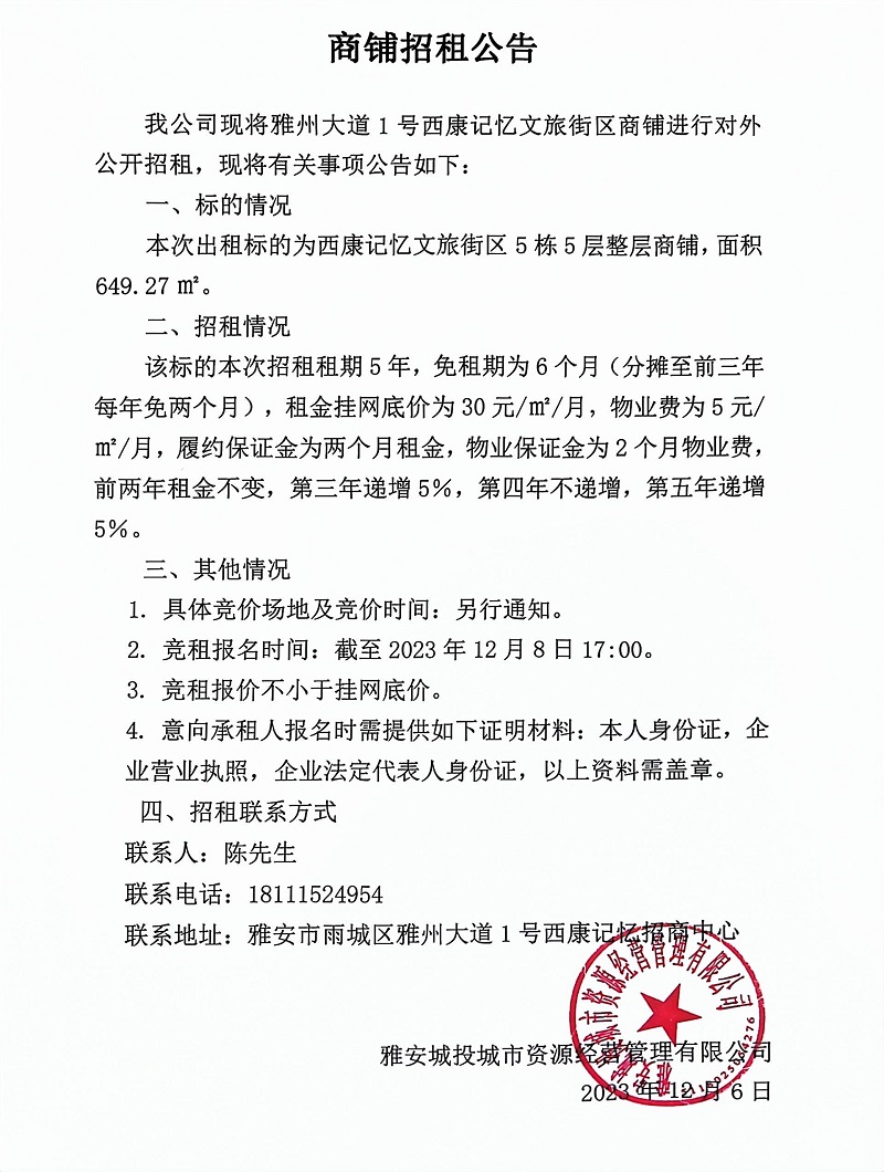 雅州大道1號西康記憶文旅街區(qū)商鋪招租公告