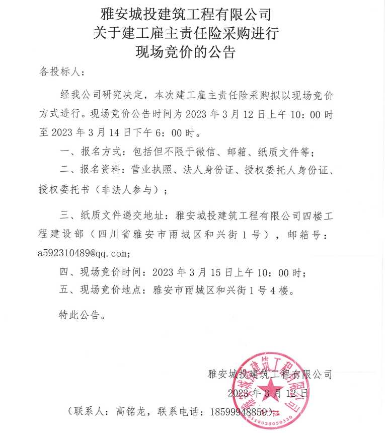 雅安城投建筑工程有限公司關(guān)于建工雇主責任險采購進行現(xiàn)場競價的公告
