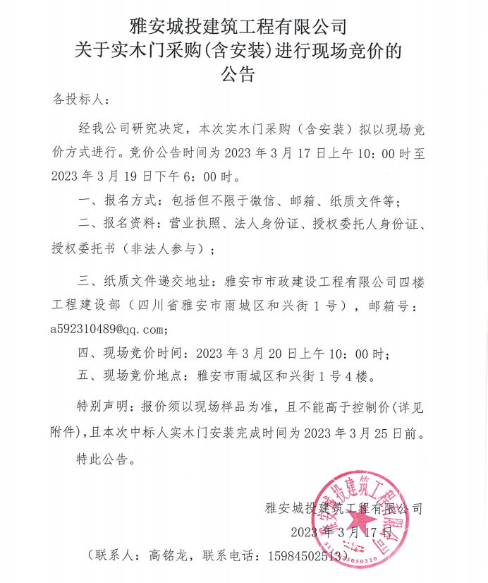 雅安城投建筑工程有限公司關(guān)于實(shí)木門采購(gòu)(含安裝)進(jìn)行現(xiàn)場(chǎng)競(jìng)價(jià)的公告