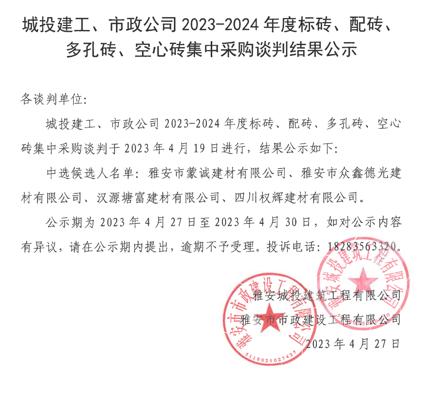 城投建工、市政公司2023-2024年度標(biāo)磚、配磚、多孔磚、空心磚集中采購(gòu)談判結(jié)果公示