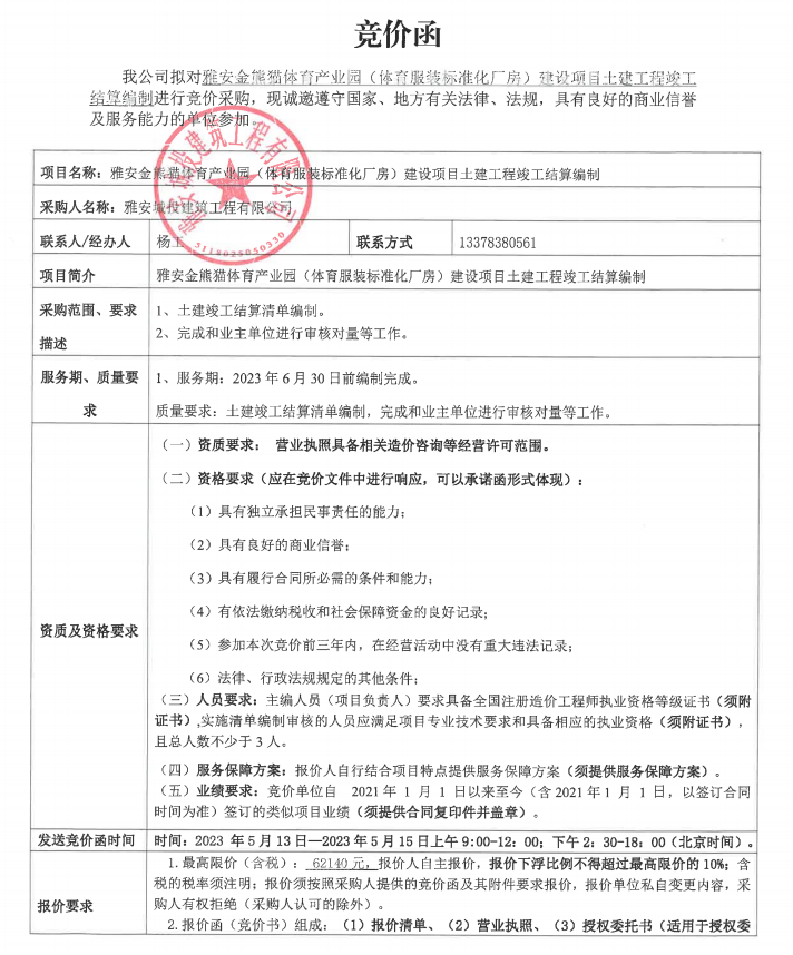 雅安金熊貓體育產業(yè)園(體育服裝標準化廠房)建設項目土建工程竣工結算編制競價公告