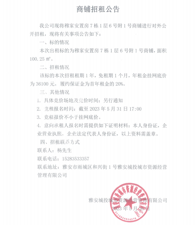 穆家安置房7棟1層6號(hào)附1號(hào)商鋪招租公告