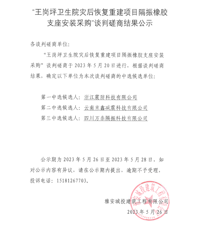 “王崗坪衛(wèi)生院災(zāi)后恢復(fù)重建項目隔振橡膠支座安裝采購”談判磋商結(jié)果公示