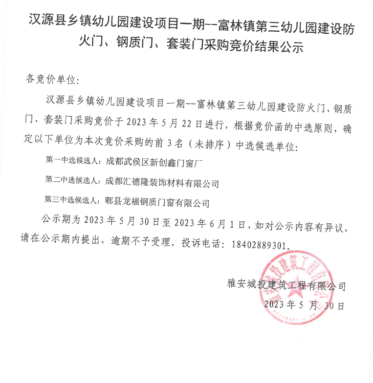 漢源縣鄉(xiāng)鎮(zhèn)幼兒園建設(shè)項(xiàng)目一期--富林鎮(zhèn)第三幼兒園建設(shè)防火門、鋼質(zhì)門、套裝門采購競(jìng)價(jià)結(jié)果公示