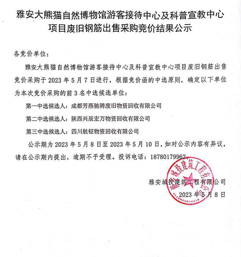 雅安大熊貓自然博物館游客接待中心及科普宣教中心項目廢舊鋼筋出售采購競價結(jié)果公示