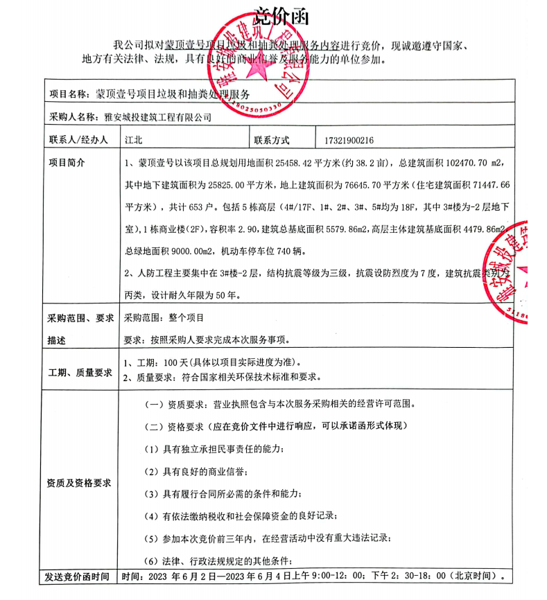 蒙頂壹號(hào)項(xiàng)目垃圾和抽糞處理服務(wù)競價(jià)公告