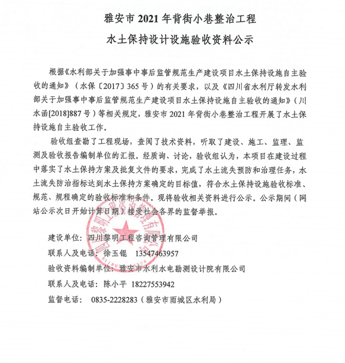 雅安市2021年背街小巷整治工程水土保持設(shè)計(jì)設(shè)施驗(yàn)收資料公示