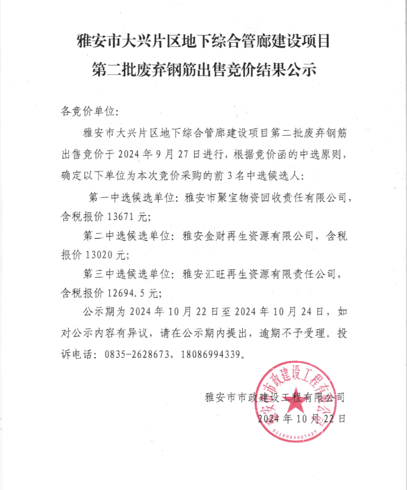 雅安市大興片區(qū)地下綜合管廊建設(shè)項(xiàng)目第二批廢棄鋼筋出售競(jìng)價(jià)結(jié)果公示