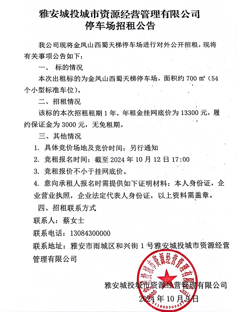 雅安城投城市資源經(jīng)營(yíng)管理有限公司關(guān)于金鳳山西蜀天梯停車(chē)場(chǎng)招租的公告