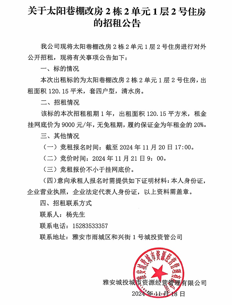 關于太陽巷棚改房2棟2單元1層2號住房的招租公告