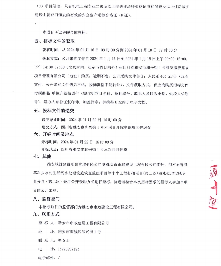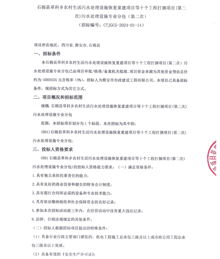 石棉縣草科鄉(xiāng)農村生活污水處理設施恢復重建項目等十個工程打捆項目(第二次)污水處理設施專業(yè)分包競價公告