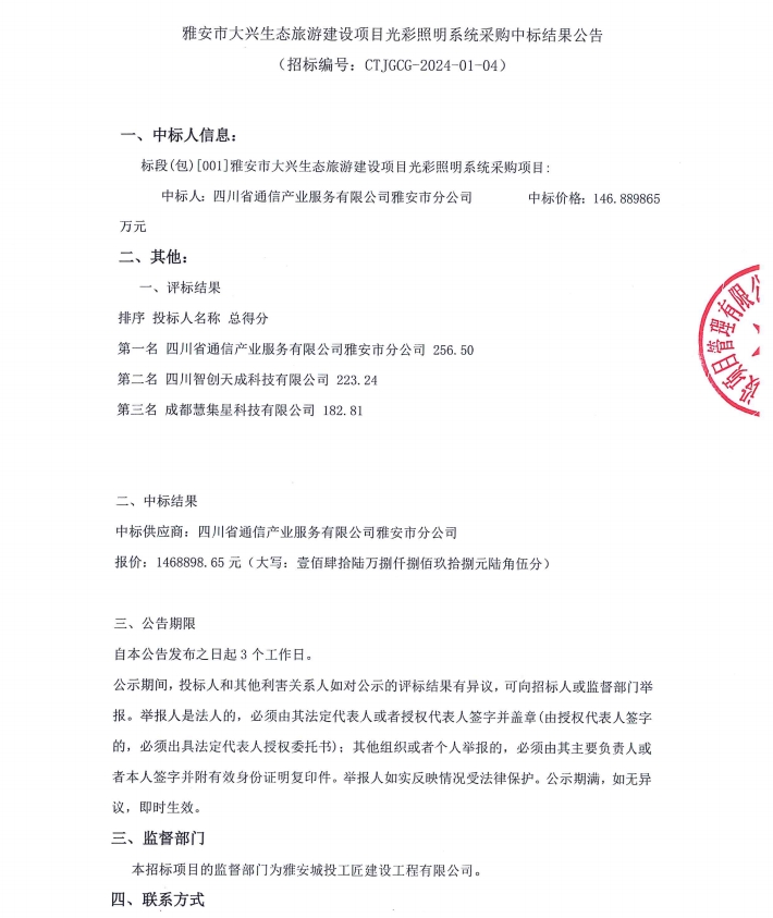 雅安市大興生態(tài)旅游建設(shè)項(xiàng)目光彩照明系統(tǒng)采購(gòu)中標(biāo)結(jié)果公告