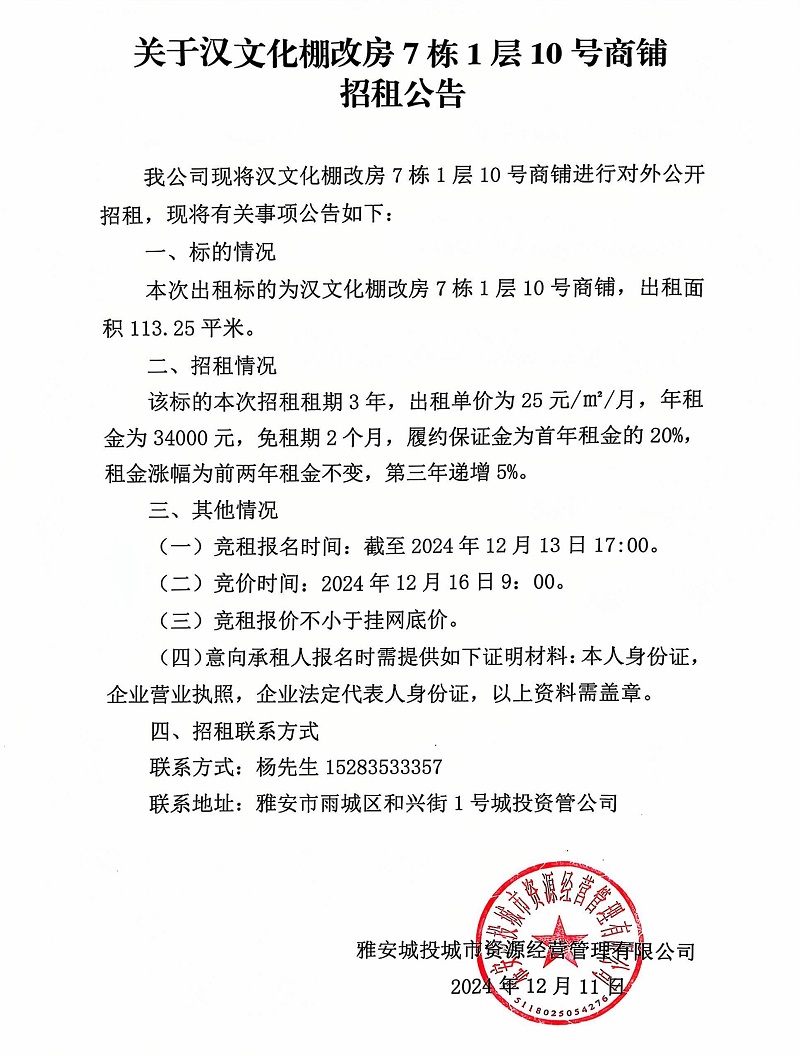 關(guān)于漢文化棚改房7棟1層10號商鋪的招租公告