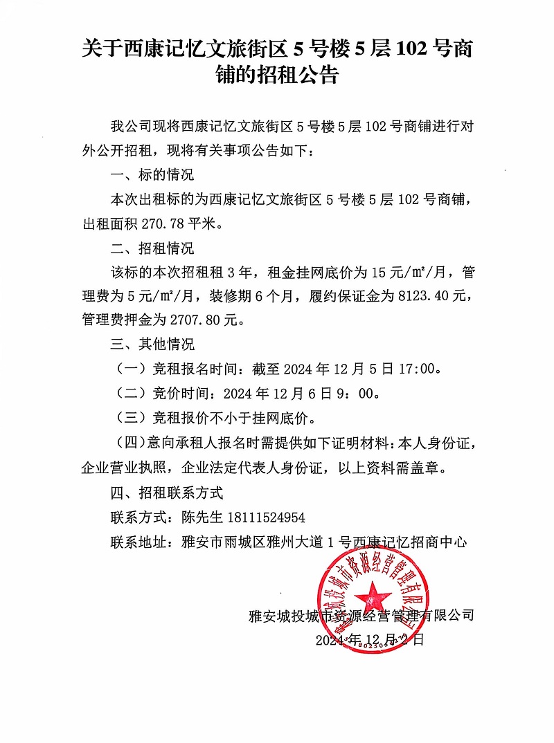 關(guān)于西康記憶文旅街區(qū)5號(hào)樓5層102號(hào)商鋪的招租公告