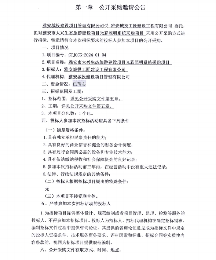 雅安市大興生態(tài)旅游建設(shè)項(xiàng)目光彩照明系統(tǒng)采購(gòu)項(xiàng)目公開采購(gòu)邀請(qǐng)公告