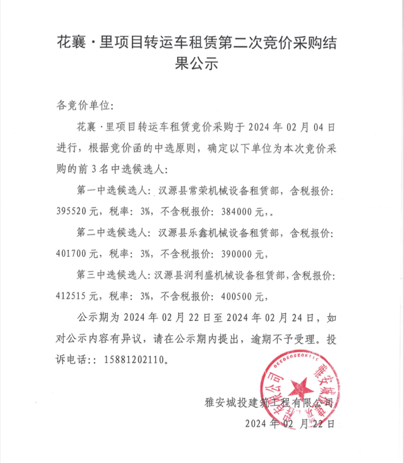 花襄·里項目轉(zhuǎn)運車租賃第二次競價采購結(jié)果公示