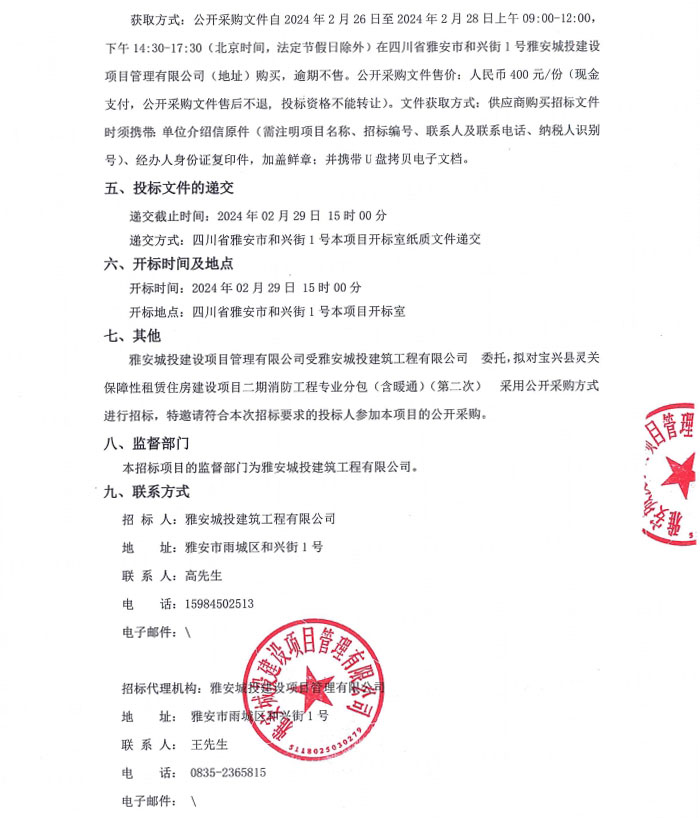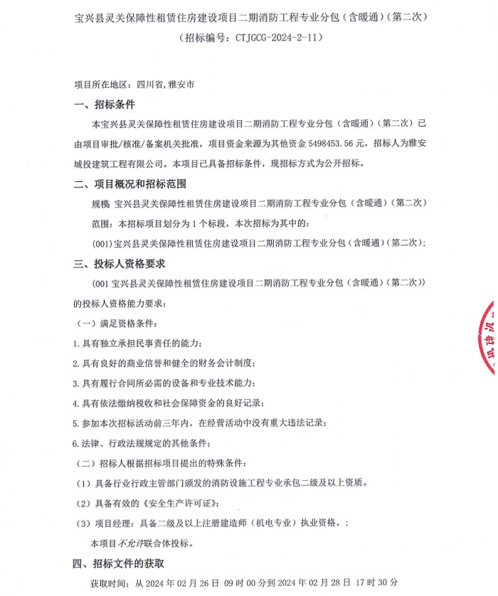 寶興縣靈關(guān)保障性租賃住房建設(shè)項(xiàng)目二期消防工程專(zhuān)業(yè)分包(含暖通)(第二次)公告