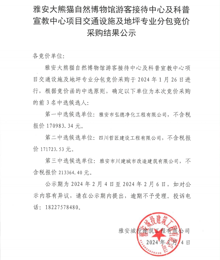 雅安市大熊貓自然博物館游客接待中心及科普宣教中心項目交通設施及地坪專業(yè)分包競價采購結(jié)果公示