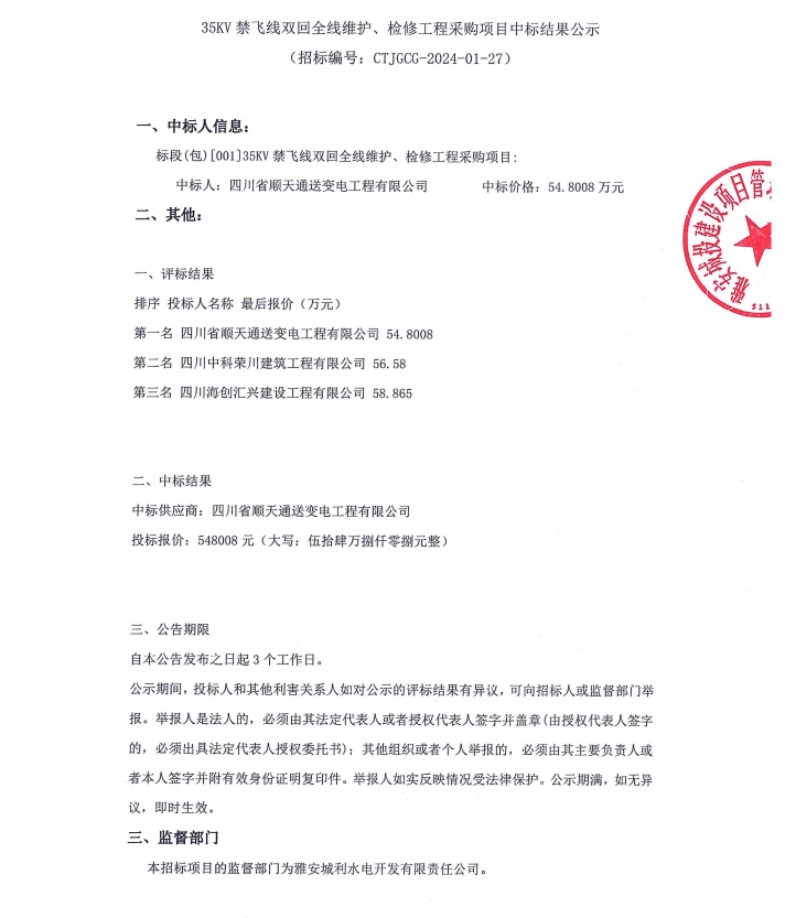 35KV禁飛線(xiàn)雙回全線(xiàn)維護(hù)、檢修工程采購(gòu)項(xiàng)目中標(biāo)結(jié)果公示