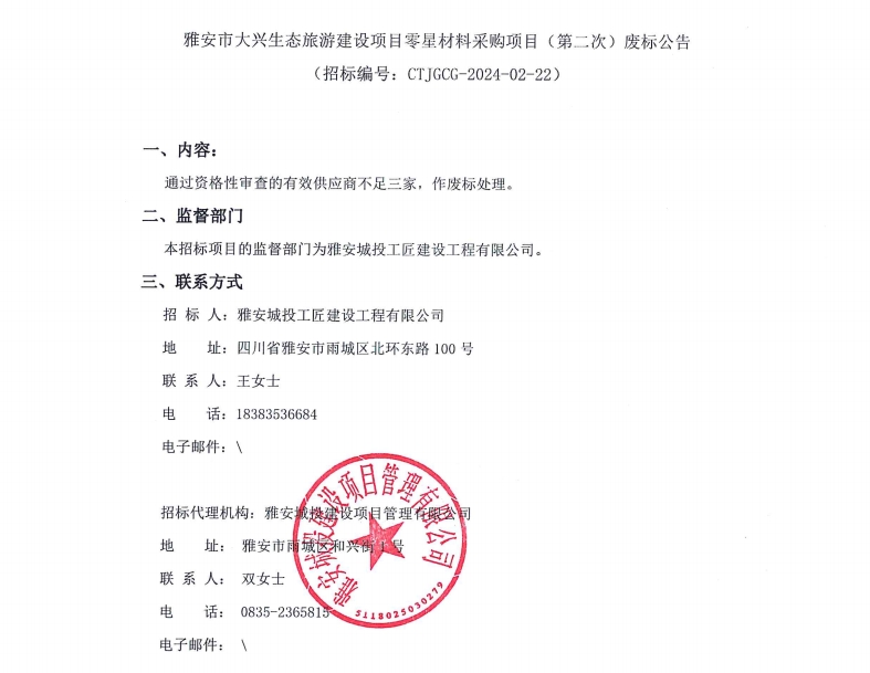 雅安市大興生態(tài)旅游建設(shè)項(xiàng)目零星材料采購項(xiàng)目(第二次)廢標(biāo)公告